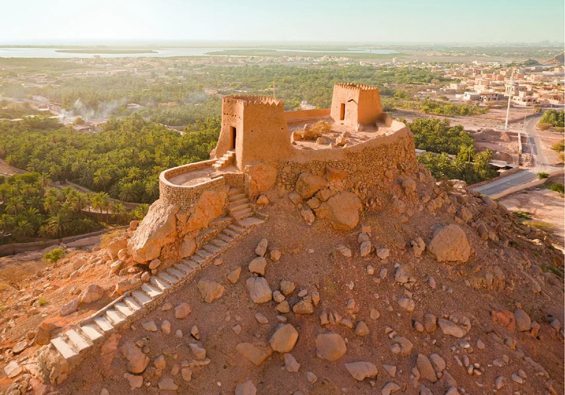 First, explore Dhayah Fort, a historic hilltop fort offering panoramic views of palm groves and surrounding mountains.